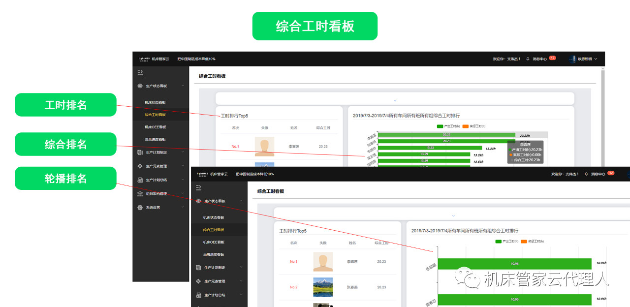 工人可以直接在看板查看自己产出工时排名,也会让工人有竞争意识,让勤奋员工获得认可,让落后员工被暴露出来(员工感觉面子挂不住就会积极改进)